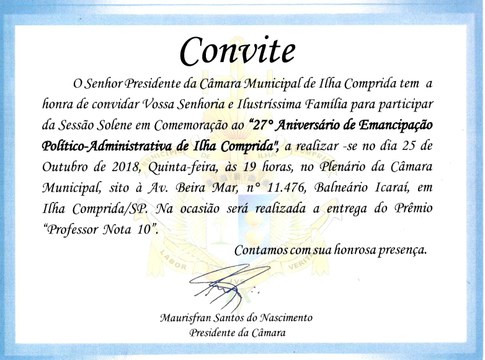 Realização de Sessão Solene, aberta a toda a população, em comemoração do 27º Aniversário de Emancipação Política e Administrativa da Cidade de Ilha Comprida.