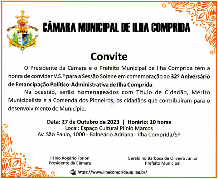 CMIC, 27/10/23 - A cidade de Ilha Comprida, comemora neste dia 27 de outubro, 32 anos de Emancipação Política em Administrativa, com a realização de Sessão Solene no Espaço Cultural Plínio Marcos.