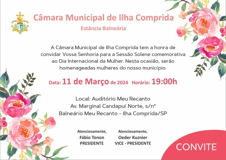 CMIC, 09/03/24 - Nesta segunda-feira (11), às 19h., a nossa Câmara Municipal realizará Sessão Solene em homenagem a todas aquelas que diariamente lutam por transformar a família, a sociedade e mundo em um lugar onde impere o amor e a vida.