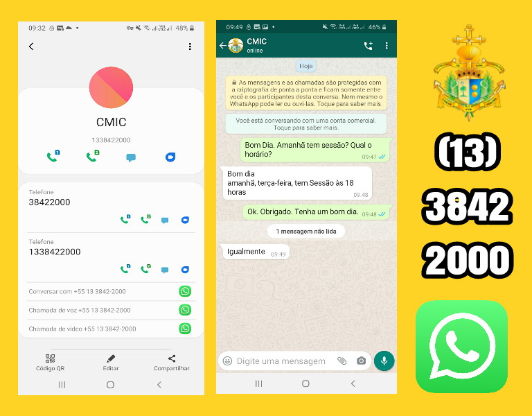 CMIC, 09/08/21 – A Câmara Municipal, desde a semana passada como teste e definitivamente a partir de hoje, também disponibilizou o atendimento aos munícipes pelo aplicativo WhatsApp. O número é o mesmo do telefone fixo (13) 3842-2000. Para se comunicar com a Câmara Municipal basta adicionar esse número aos seus contatos e ele já aparecerá na tela do aplicativo como uma das opções de contato.