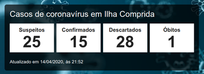 Os exames que comprovaram a morte por Coronavírus chegaram ao município hoje 14/04. Sem velório, o enterro aconteceu no Cemitério da Vila Nova, na Ilha Comprida, de acordo com protocolo de segurança do Covid-19. Com o óbito confirmado hoje, a Ilha Comprida passa a contabilizar 15 casos confirmados de Coronavírus (dos quais esse óbito) , 25 suspeitos e 28 descartados.