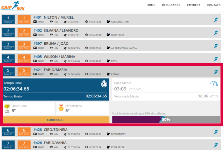 Nesta etapa os atletas da Eqmax/Ilha Comprida, Fábio/Glorinha (Maria) foram muito bem classificados (5º Lugar) na categoria “Sport Casal 40 Km“ e isso corroborou para que também finalizassem a competição anual na 5ª Colocação Geral.