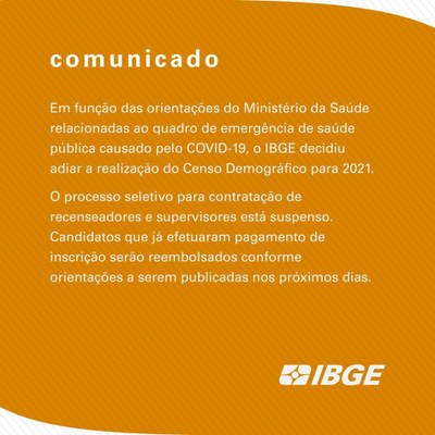 O processo seletivo para contratação de recenseadores e supervisores está suspenso. Candidatos que já efetuaram o pagamento da taxa de inscrição serão reembolsados conforme orientações a serem publicadas nos próximos dias.