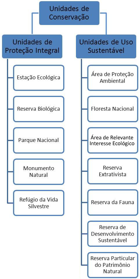 Existem cinco tipos de Unidades de Proteção Integral e sete tipos de Unidades de Uso Sustentável, veja abaixo: