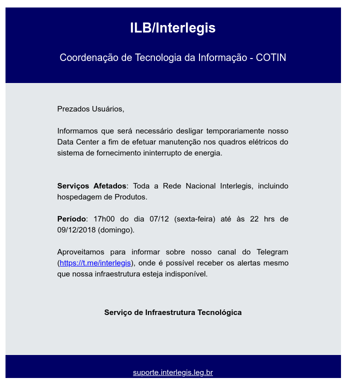 A manutenção programada pelo INTERLEGIS (mantenedores dos sistemas) ocorrerá no período de 07/12 (sexta-feira) à 09/12 (domingo). No período indicado o site possivelmente ficará "fora do ar".