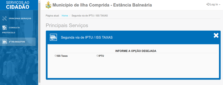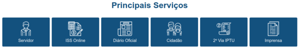 Esta opção está disponibilizada no início da página ("Principais Serviços") do site oficial do município e ao clicar nele você é redirecionado para a opção de de imprimir segundas vias do IPTU, ISS ou TAXAS e ainda pode consultar seus protocolos de solicitações anteriores.