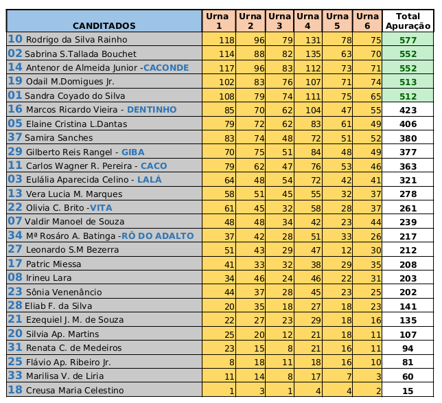 Lista oficial do resultado da eleição ocorrida neste domingo (06/10). Eleitos: 1º - Rodrigo Rainho; 2º - Sabrina Bouchet; 3º - Antenor Júnior; 4º - Odail Júnior e 5º - Sandra Coyado.
